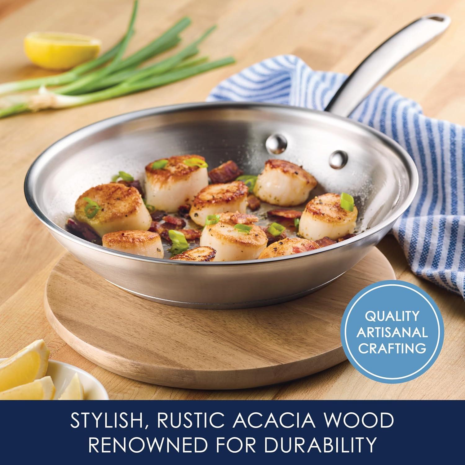 Move seamlessly from prep to presentation with the versatile Rachael Ray® Magnetic Acacia Trivet with Silicone Feet. Designed to protect dining tables and countertops from hot pans, this trivet will come in handy whether you’re serving up a skillet of mac ‘n’ cheese for a weeknight meal or hosting a family-style dinner party. Made of beautiful acacia wood, the surface of this trivet is naturally resistant to moisture and heat, meaning it can handle the wear and tear of repeated washing and the heat of pans just pulled off the stove. It’s also magnetic, so it follows you and your pans from the kitchen to the table when used with induction, stainless steel, and cast iron cookware. Stylish, rustic, and durable, the Rachel Ray Magnetic Acacia Trivet is an essential in every home cook’s collection. Time to get trivey with it!